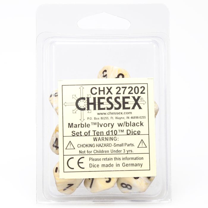 D10 Clamshell Marble Ivory With Black (10) D10 Clamshell Marble Ivory With Black (10) Save $-10.95 0 0 / total reviews: () Soldout Regular price $10.95 D10 Clamshell Marble Ivory With Black (10) Chessex Manufacturing Quantity Decrease quantity for D10 Clamshell Marble Ivory With Black (10) Increase quantity for D10 Clamshell Marble Ivory With Black (10) Sold out
