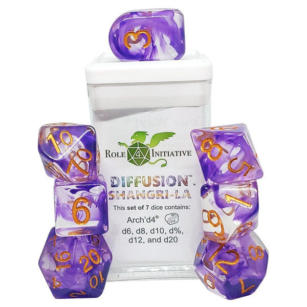 This 7-set of polyhedral diffusion dice features a larger size than traditional dice, resulting in improved visibility and rollability. The Arch'd d4 serves as a superior option to the standard d4, boasting a bigger design that makes it easier to pick up and roll. Additionally, the Balance'd d20 guarantees a more balanced distribution of results as each adjacent group of 5 sides adds up to 52 or 53. The set includes an Arch'd d4, d6, d8, d10, d%, d12, and Balance'd d20.