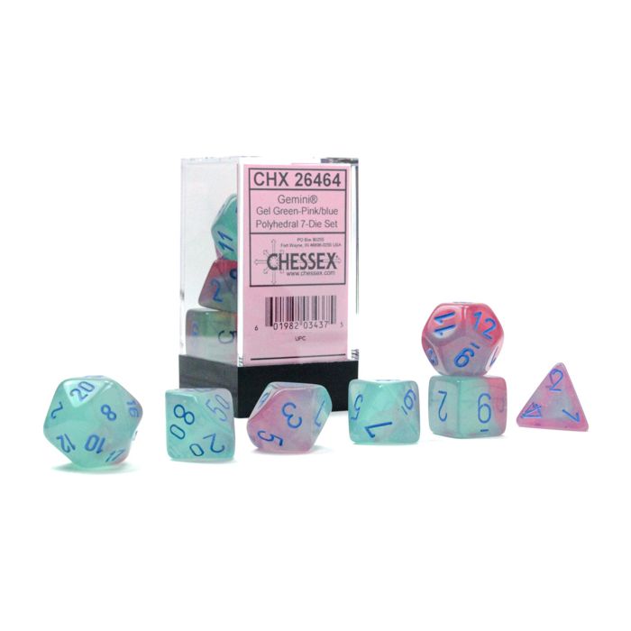 Perfect for tabletop RPGs like Dungeons & Dragons, this set features 7 Gemini Gel Green-Pink dice with blue numbers, including: