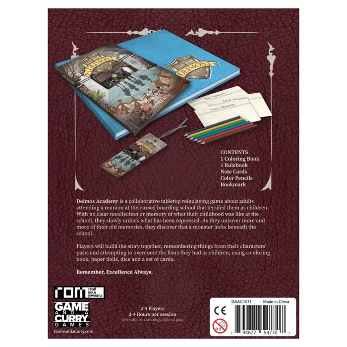Deimos Academy is a GM-less horror tabletop roleplaying game in a coloring book about adults returning to face the cursed boarding school that terrified them as children. Players are the adults who must attend a reunion at the school. With no clear recollection or memory of what their childhood was like at school, they slowly unlock what has clearly been repressed. As they uncover more and more of their old memories, they discover that a monster lurks beneath.
