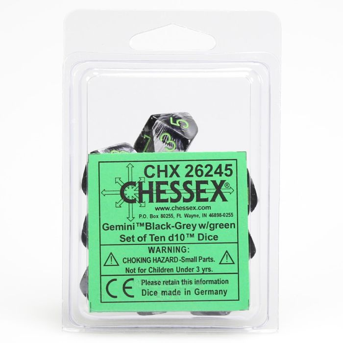 This set contains 10 Gemini Black-Shell d10 dice with white numbers (PG1046), packaged in a Plastic Clamshell for secure storage and convenient display.