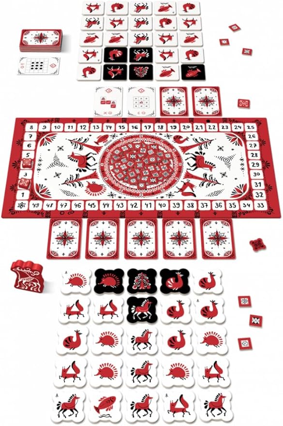 Mezen is a type of traditional Russian painting that originated in a northern town of the same name. In this game, players will act as skilled northern craftsmen, creating elaborate ornamental paintings on demand. By cleverly combining symbols and flipping tiles, players can complete goals and earn Victory Points. The player with the highest number of Victory Points at the end of the 10th round wins. During each turn, players must select a group of adjacent identical symbols to remove from their painting, causing the tiles above to slide down and fill the empty spaces. The removed tiles are then flipped and placed into the newly vacant spaces. This allows players to rearrange symbols and achieve goals, earning them victory points. Suitable for ages 8 and up, 1-5 players can enjoy this game in just 30 minutes. Contents include 125 double-sided Mezen painting tiles, 36 goal cards, 75 amulets, a game board, 5 markers to track Victory Points, a special