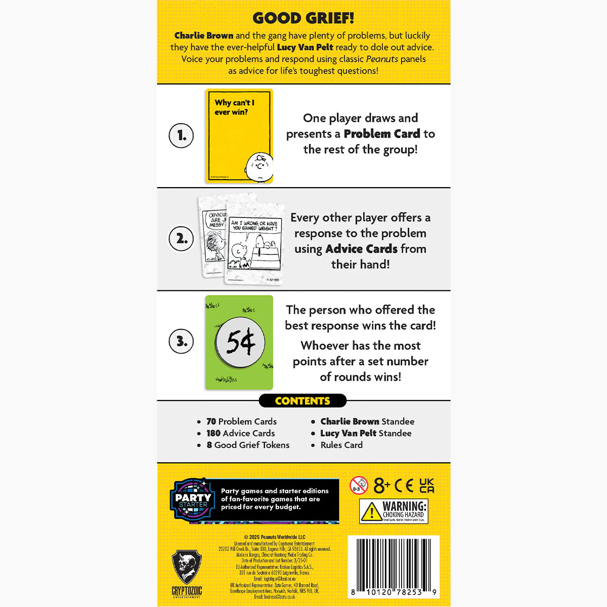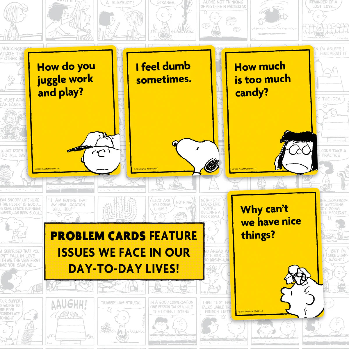 Laugh, groan, and share life’s woes with Charlie Brown, Lucy, and the rest of the Peanuts gang In this fast-paced party game, players voice their problems and respond using classic Peanuts comic panels for advice—just don’t take it too seriously