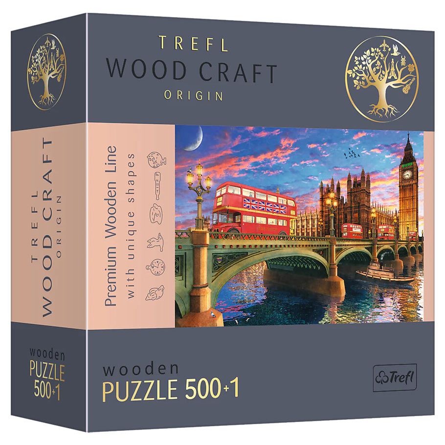 Are you a puzzle enthusiast? WOOD CRAFT wooden jigsaw puzzle by Trefl has been created just for you! Using the unique puzzle design and original puzzle figures, assemble the image and move to the heart of London. Wooden puzzles with irregular shapes are the perfect alternative to traditional puzzles with a classic form. The set consists of 500+1 elements among which as many as 50 puzzle figurines in the shape of various English symbols and monuments have been hidden. Finding them is an additional, great fun! Find Big Ben, the double-decker bus or Sherlock Holmes himself! Additionally, each puzzle piece has a decorative pattern on the reverse side. Appreciate the high quality of craftsmanship, notice the intensity of colors and eye-catching details. WOOD CRAFT wooden puzzles will delight aesthetes and puzzle lovers looking for a new dimension of entertainment. Train your memory and logical thinking skills and develop your creativity. You will see that it is a real hit and great entertainment for adults and children aged 12 and over