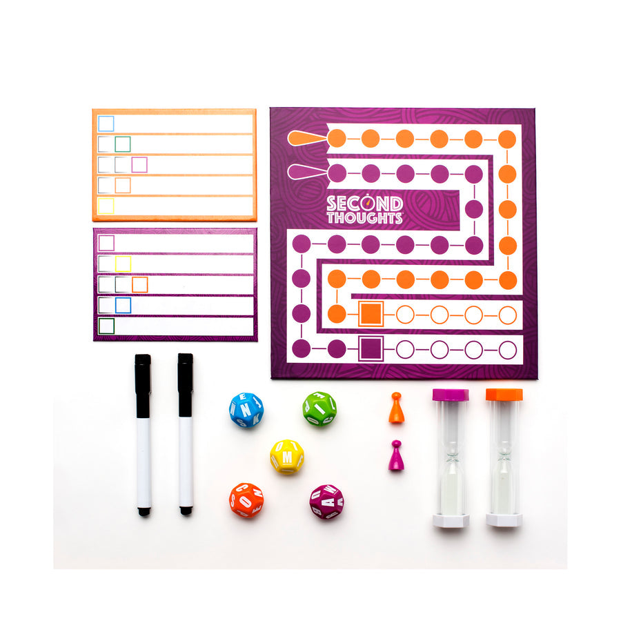 In SECOND THOUGHTS, each round is a frantic and hilarious race to outwit the other team. Teams use letters from colored dice to create a list of five things. The catch? The time it takes your team to make the list is exactly how long the opposing team has to guess your answers! It's a thrilling blend of quick thinking and fast talking. Perfect for a party and fun for ages 8 and up!