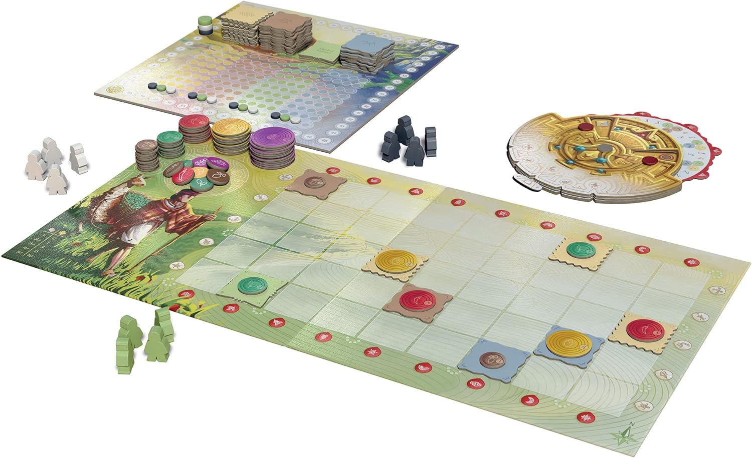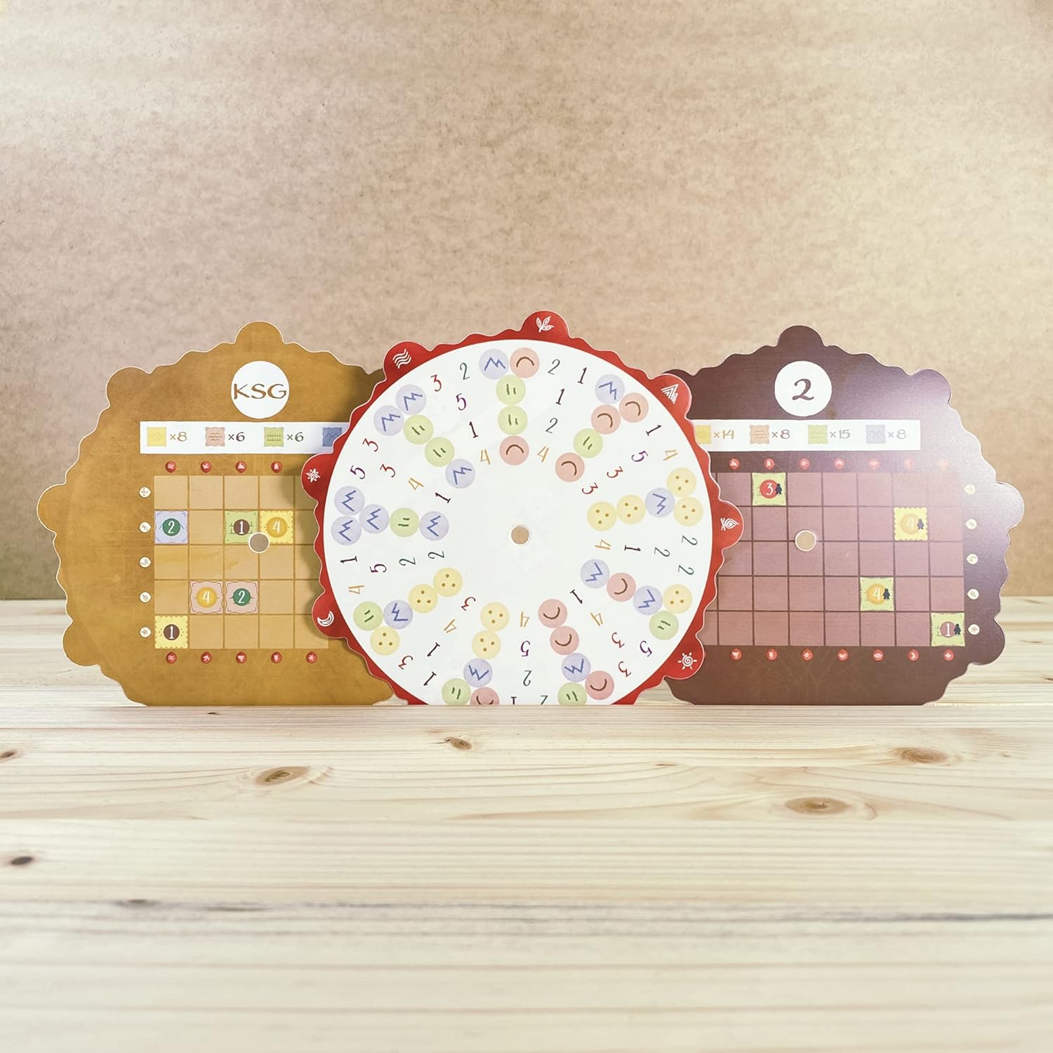 The game features a variety of scenarios, each with a unique arrangement of terrain and crop tiles. Terrain tiles vary in size from 1 to 5 spaces, with the rule that regions of the same color must not touch, even diagonally. Crop tokens come in values of 1 to 5, each with distinct sizes and colors. A region of size 1 contains only value 1 crops, size 2 includes values 1 and 2, and only size 5 contains all values. Identical crop values cannot be adjacent, even diagonally.
