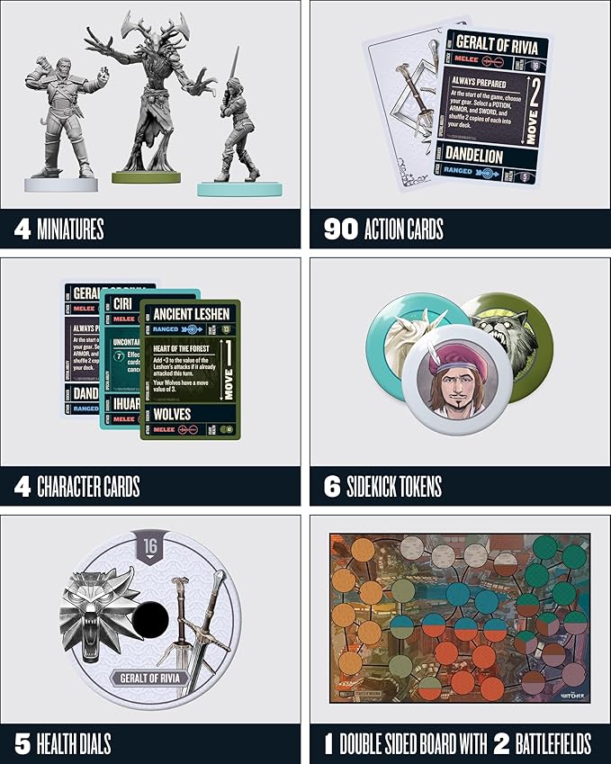 Unmatched is an asymmetrical miniature fighting game for either two or four players, offering a unique play experience that rewards expertise with tactical movement and no-luck combat resolution. Represented by a unique deck designed to evoke their style and legend, each hero in this game offers a fresh challenge, keeping gameplay exciting even for experienced players. Unmatched: Steel and Silver includes three characters and two battlefields from the beloved Witcher series, adding even more variety to the already diverse range of match-ups available.